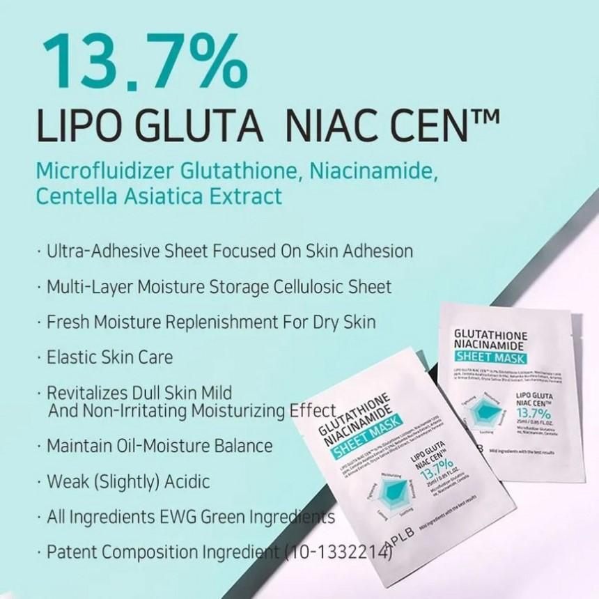 - An ultra adhesive sheet containing Microfluidizer Glutathione, Niacinamide, and Centella Asoatoca Extract focused on skin adhesion and offers fresh moisture replenishment and elastic skin care.
