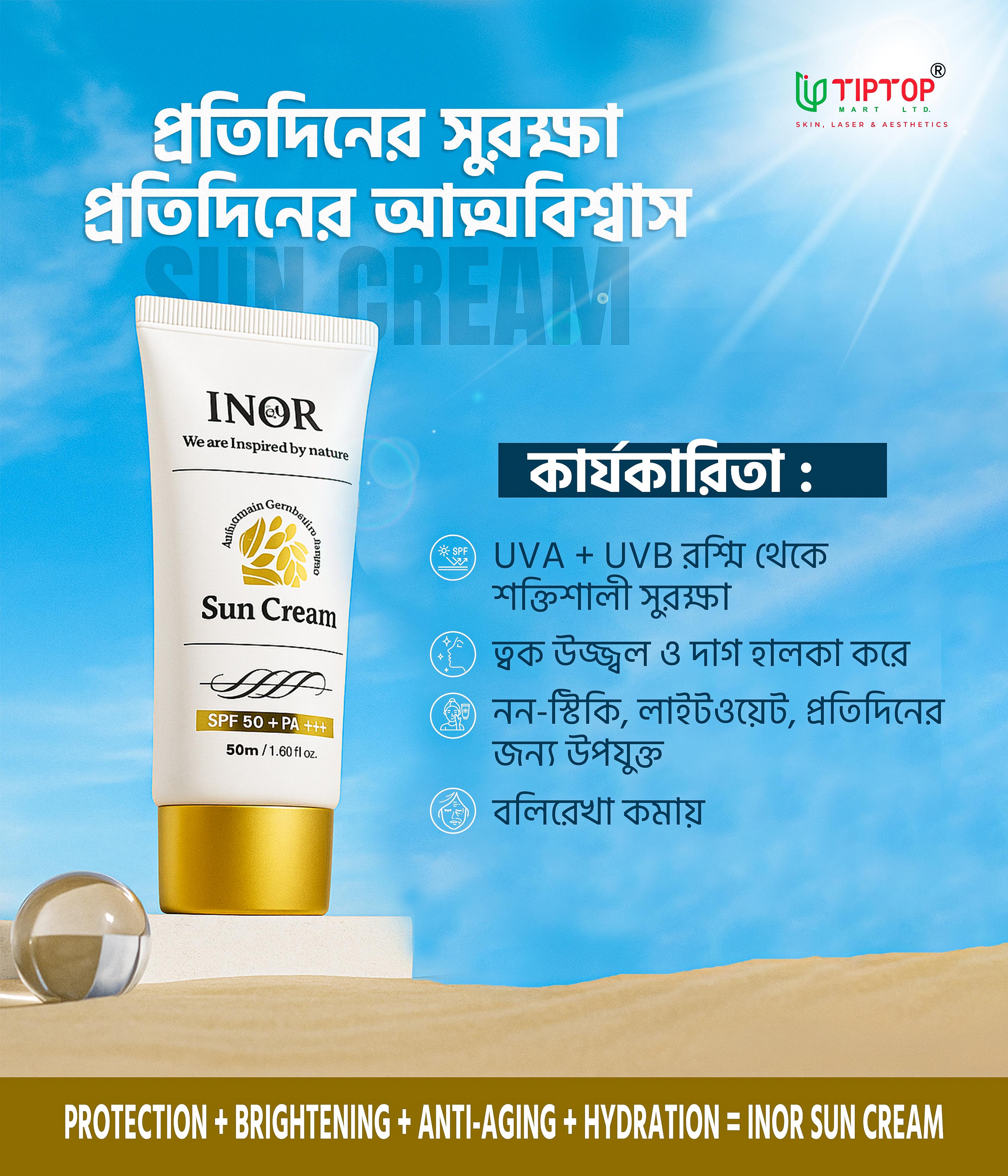 INOR Sun Cream SPF50+ / PA++++ (50ml) is designed for those who want powerful sun protection without compromising comfort. This hybrid sunscreen glides onto the skin with a refreshing, feather-light finish that leaves no white cast, stickiness, or heaviness.