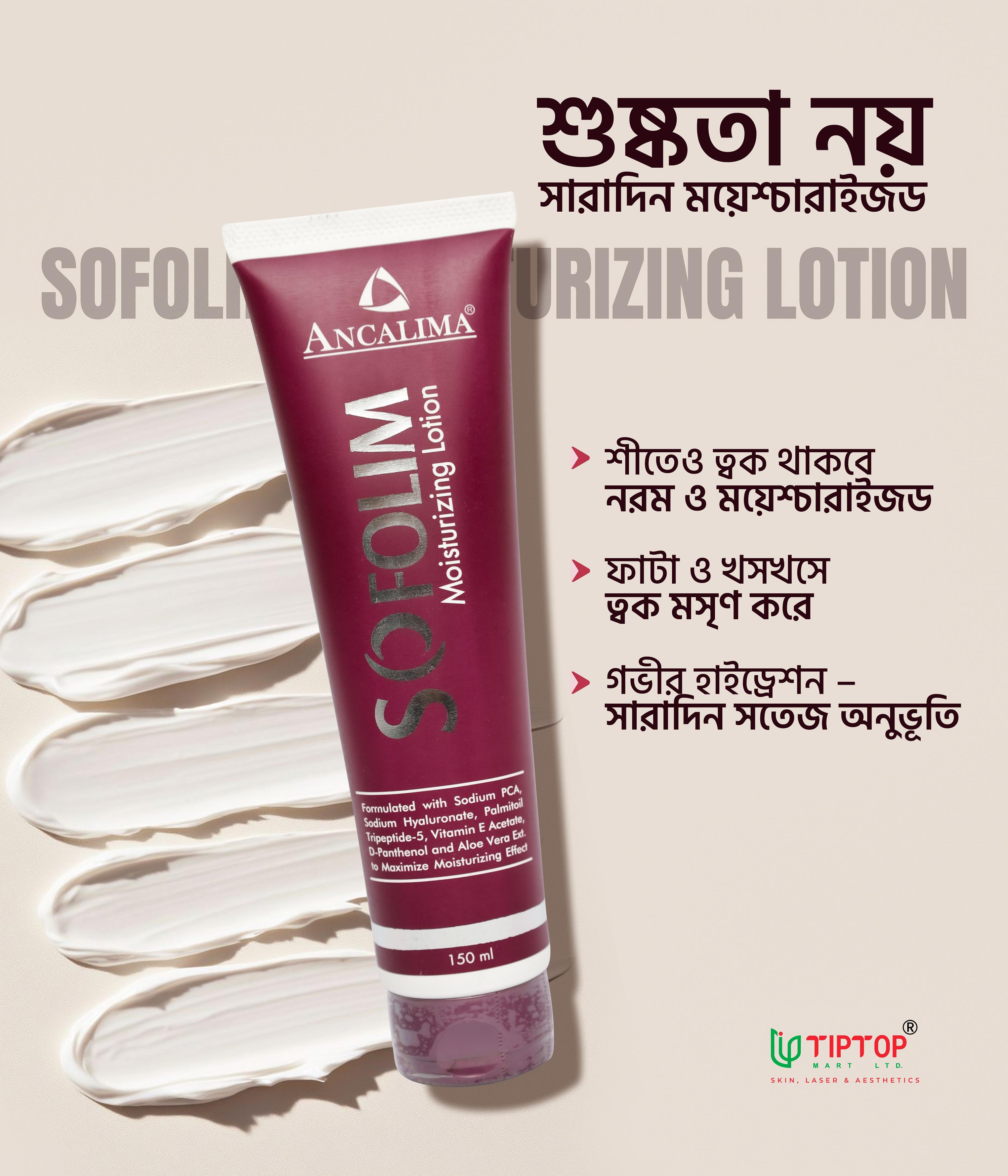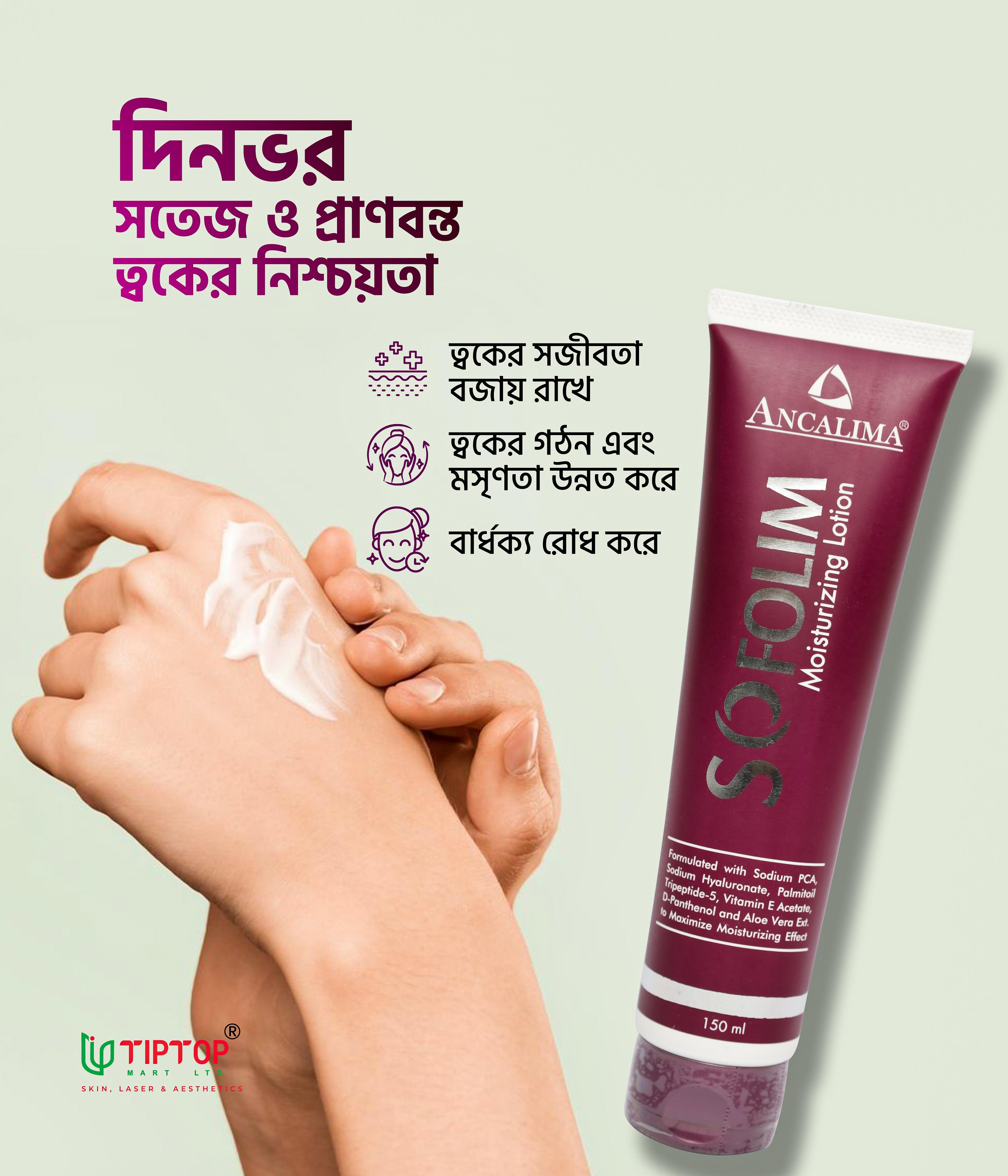 Sofolim Moisturizing lotion is a specially formulated Moisturizing lotion which helps to maintain skin health & vitality, providing essential hydration, nourishment and protection to the skin. It keeps skin young & firm with its Anti-Ageing ingredients like Peptide, Hyaluronic acid. Suitable for all skin types, age groups & weather conditions.