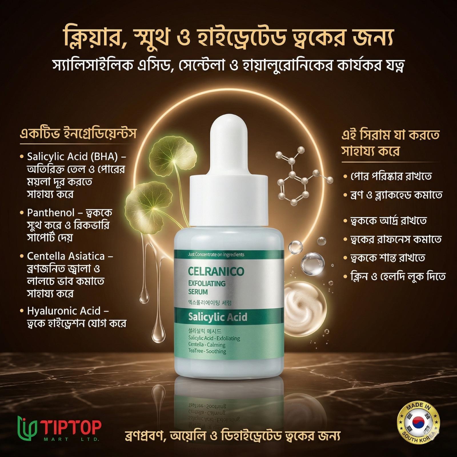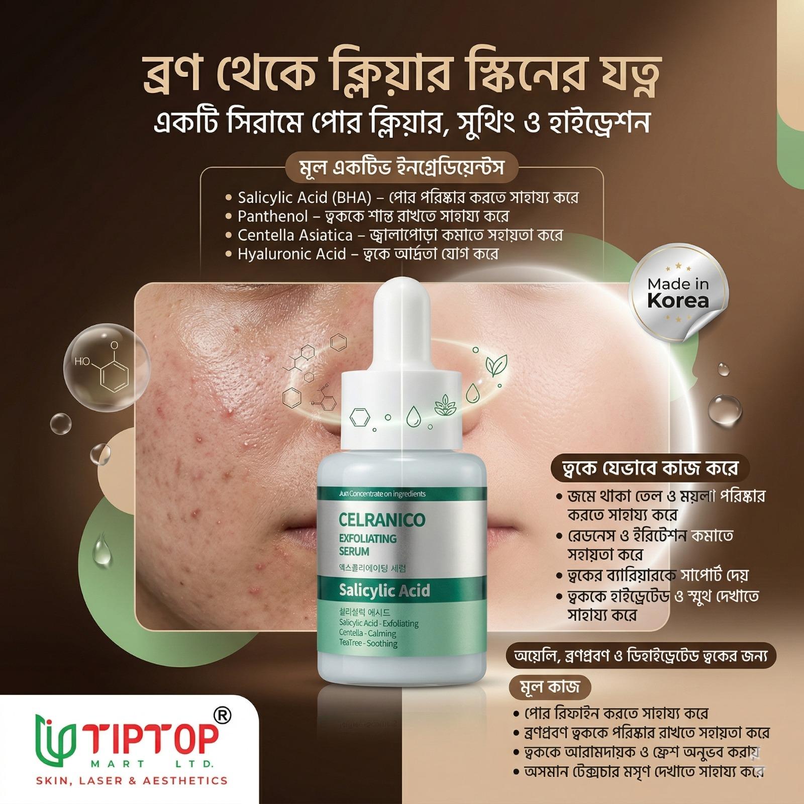 Salicylic acid exfoliates inside the pores, removing excess oil, dead skin cells, and debris that cause breakouts. It helps minimize the appearance of blackheads, whiteheads, and uneven texture.